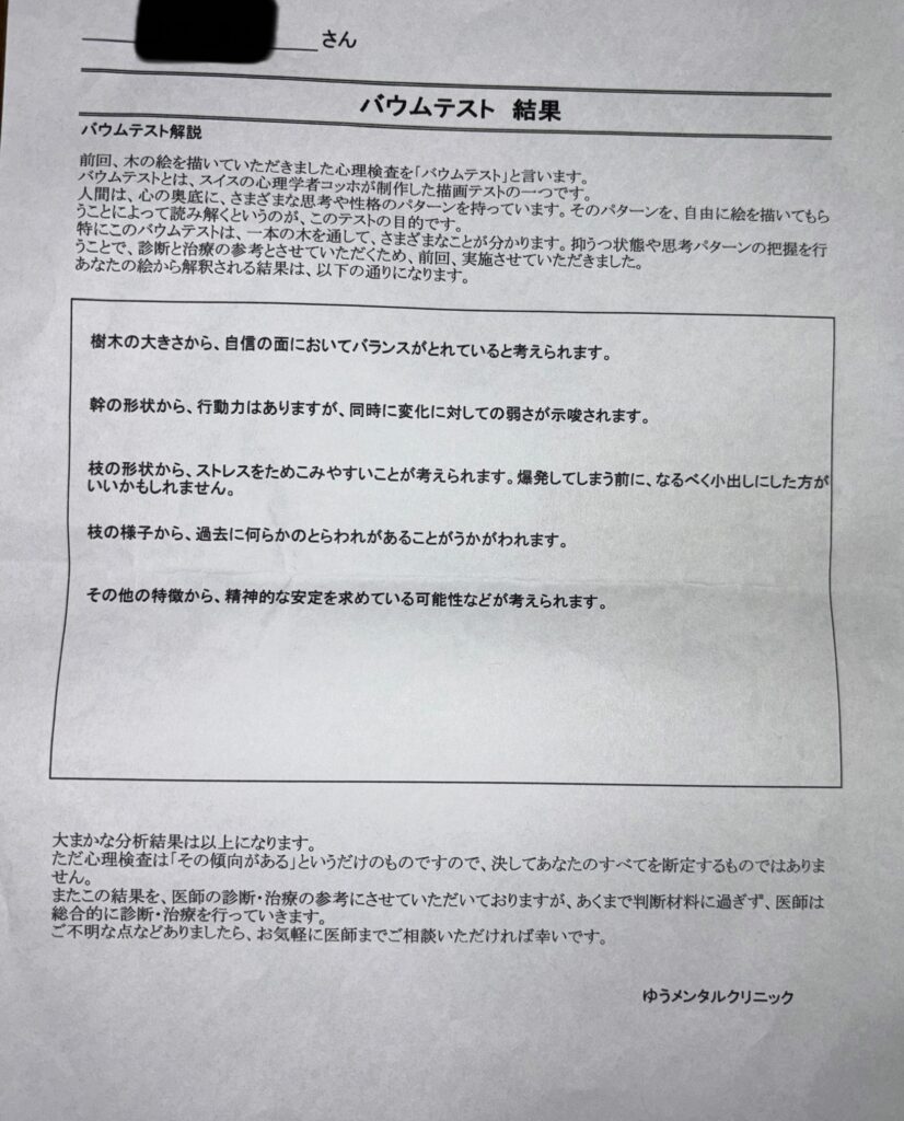 バウムテストは、紙に木を描くことで、ストレスの傾向や対人距離感、エネルギーの使い方などを“総合的に”見るタイプの検査だと言われました。
