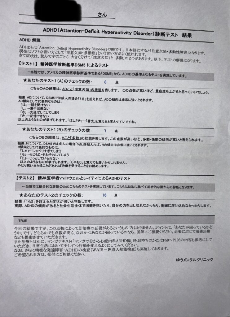 テスト2(別方式のADHDテスト):16点(14点超で症状が強い目安、と記載)