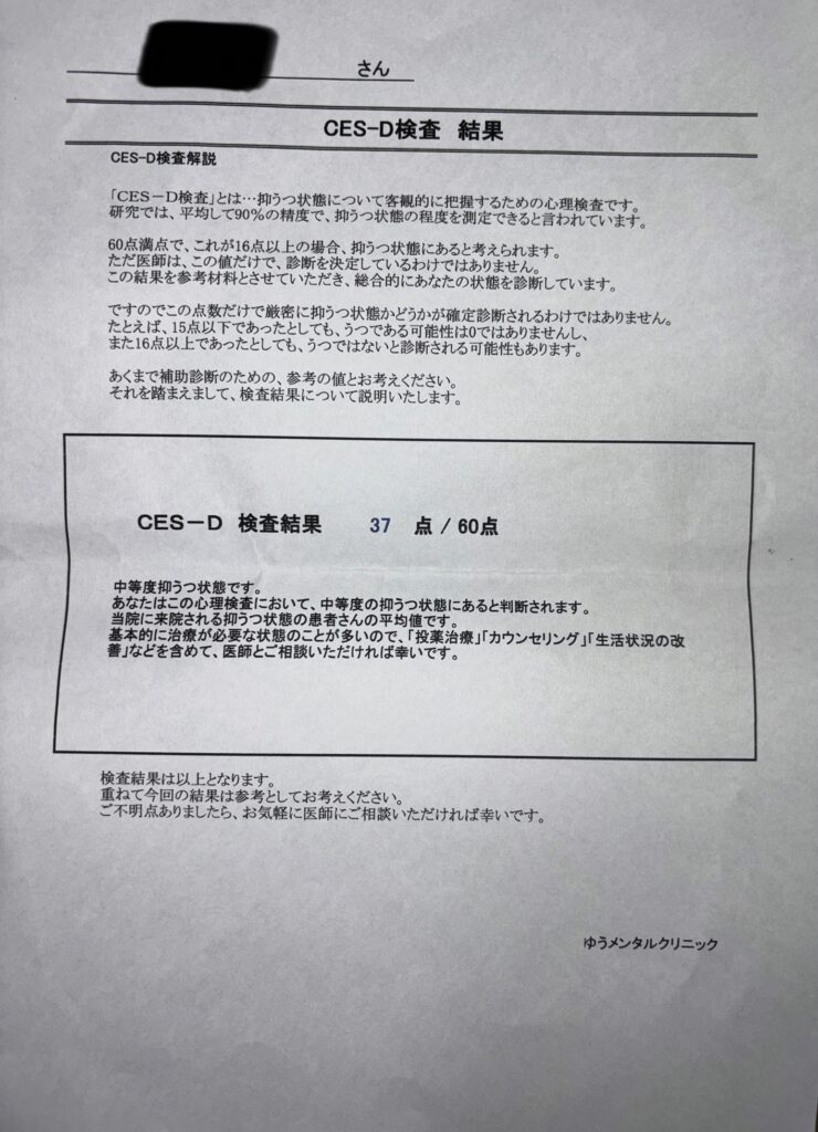 用紙には「中等度抑うつ状態」「基本的に治療が必要な状態の可能性」といった内容が書かれていました。